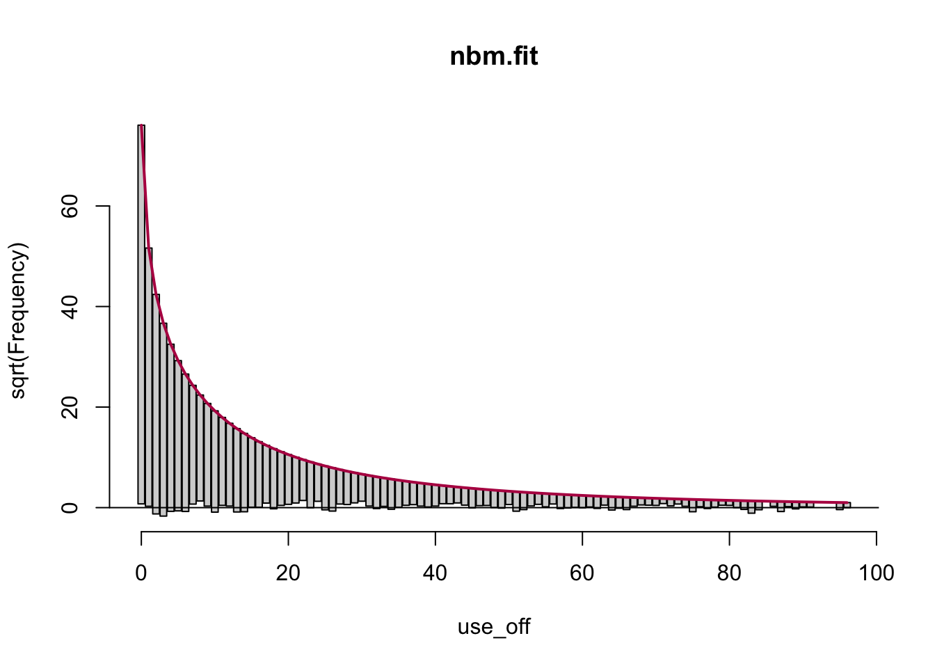 Finalmente, podemos analizar el grado de ajuste de un modelo de regresión binomial negativo mediante un rootograma. Este representa la raiz cuadrada tanto de las frecuencias pronosticadas por el modelo como de las frecuencias empíricas (observadas) Las primeras se representan por puntos conectados por segmentos de línea y las segundas como un gráfico de barras.