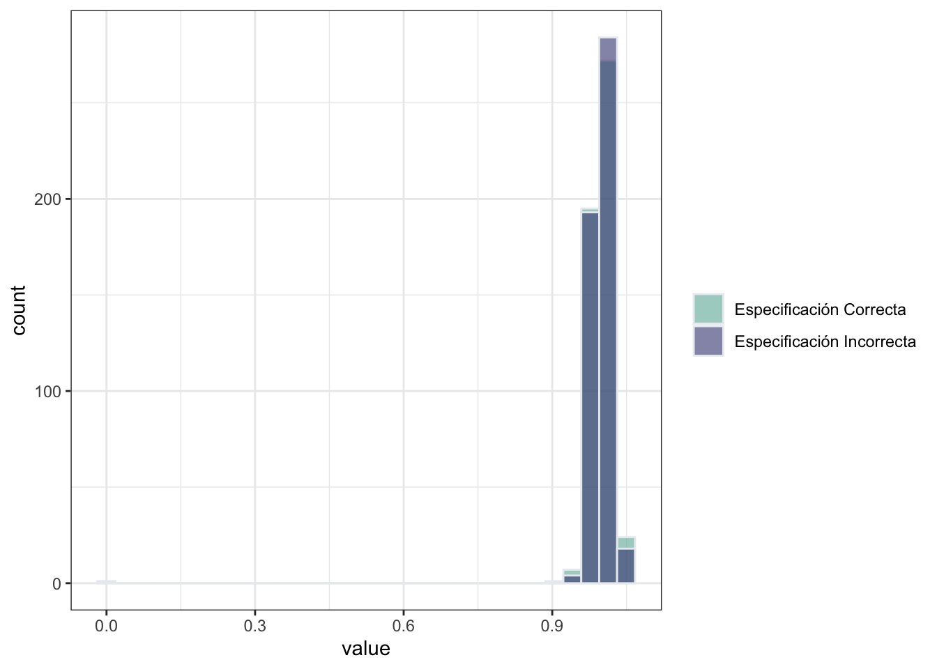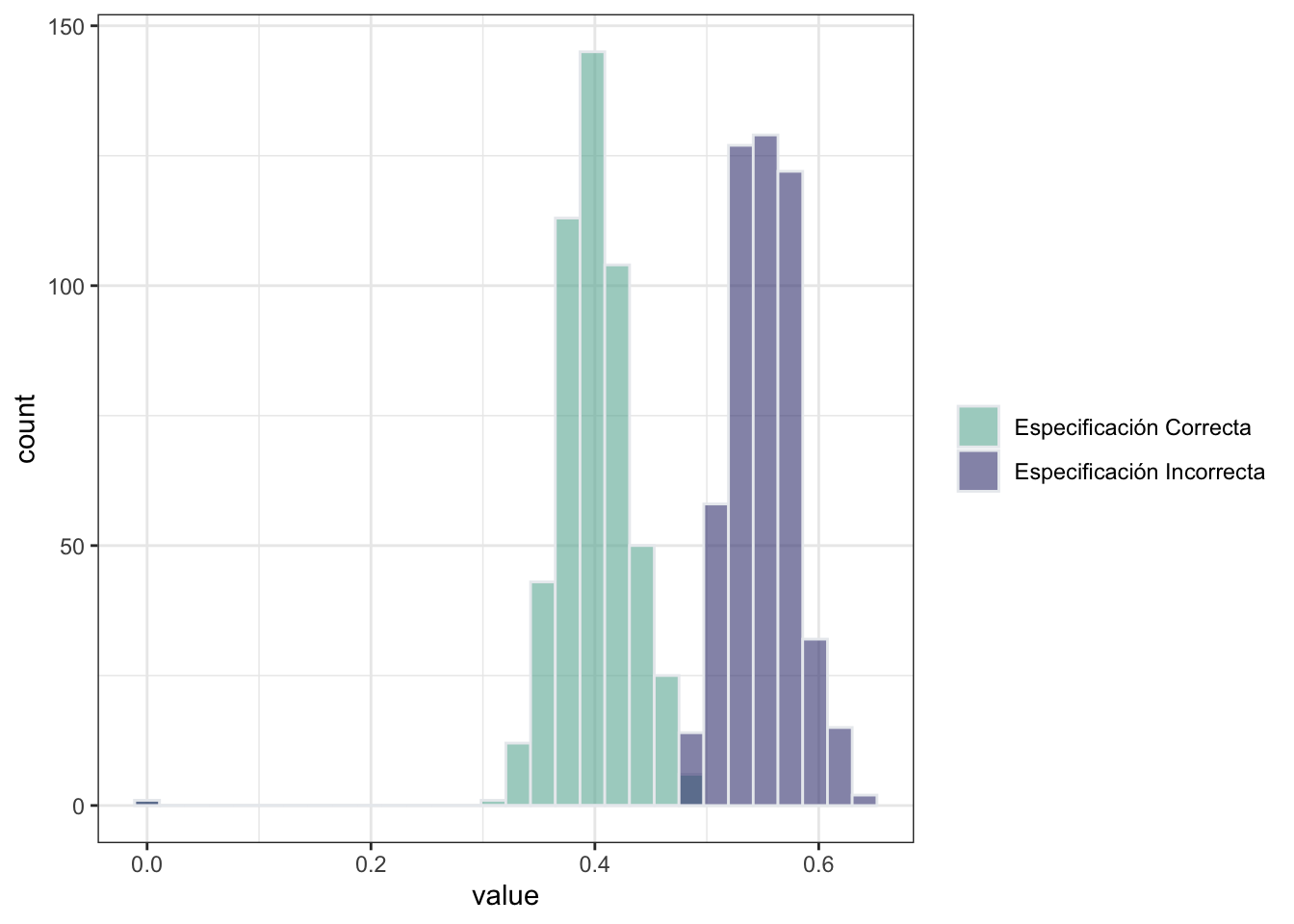 Para visualizar los resultados, comparamos la distribución del efecto marginal promedio con especificación correcta y con especificación incorrecta. En esta, podemos ver que el efecto marginal promedio de \(x\) sobre \(y\) es consistente aun cuando el modelo no está bien especificado. Esto se debe a que la distribición de \(x\) que hemos elegido es simétrica.